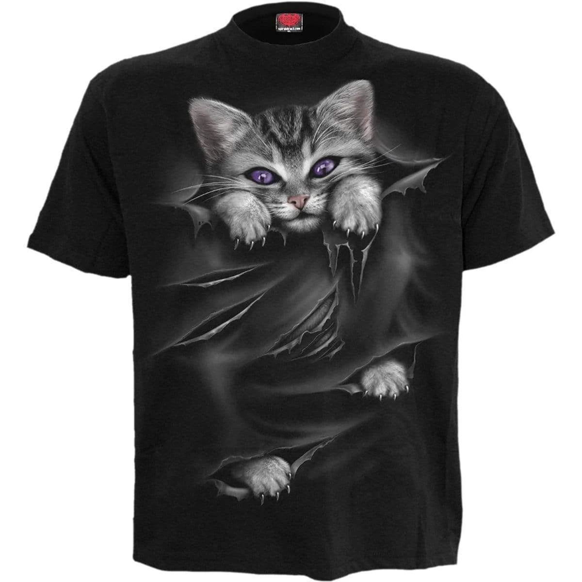 A cute kitten with purple eyes peeks out of the slashed top. Front Print T-Shirt Black is made of Top Quality 100% Cotton, Jersey using skin friendly, Azo-free, Reactive dyes.