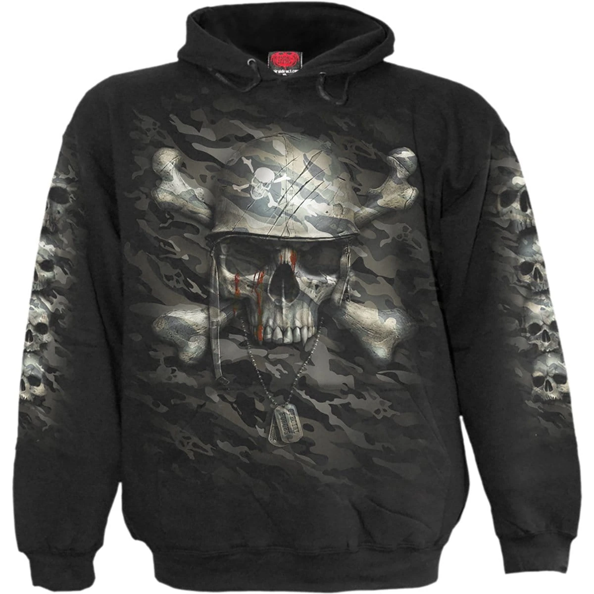 All the classic Spiral stylings with an aggressive military overtone. Camouflage patterns cover the entirety of this design, submerging an ultra-detailed skull. Pledge your allegiance to the darkness. Hoody Black is made of Top Quality 100% Cotton, Fleece using skin friendly, Azo-free, Reactive dyes.
