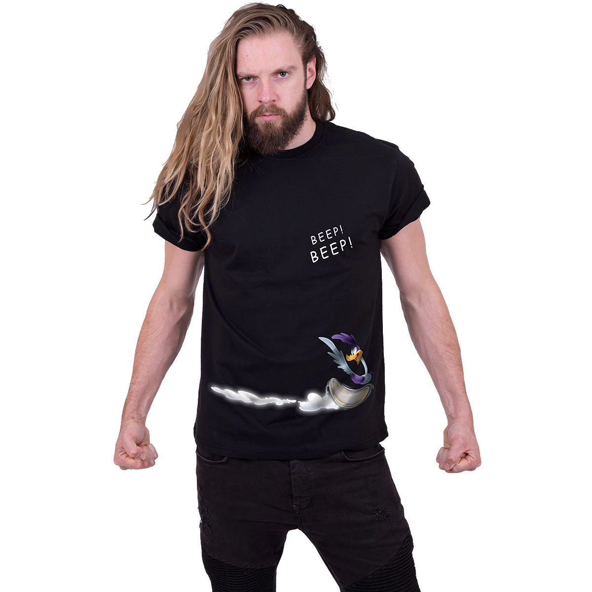 Officially licensed Warner Bros product. Wile E Coyote just can’t catch a break…or that annoyingly speedy Roadrunner! On the front we see the cheeky bird zooming along, leaving Wile E Coyote on the back looking utterly clueless. One day, Wile E, one day.