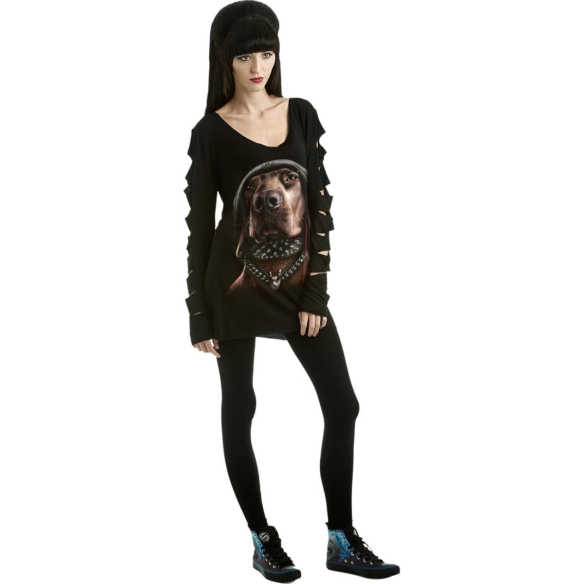 This K-9 DJ will drop the beats, just as long as you’re down to throw some doggy teats. Too legit to sit, man’s best friend is one bad-ass dog with his piercings, flesh tunnels and ‘kerb’ chains. Slashed Sleeve Boatneck Top is made of mainly 95% Viscose 5% Elastane, Jersey using skin friendly, Azo-free, Reactive dyes.