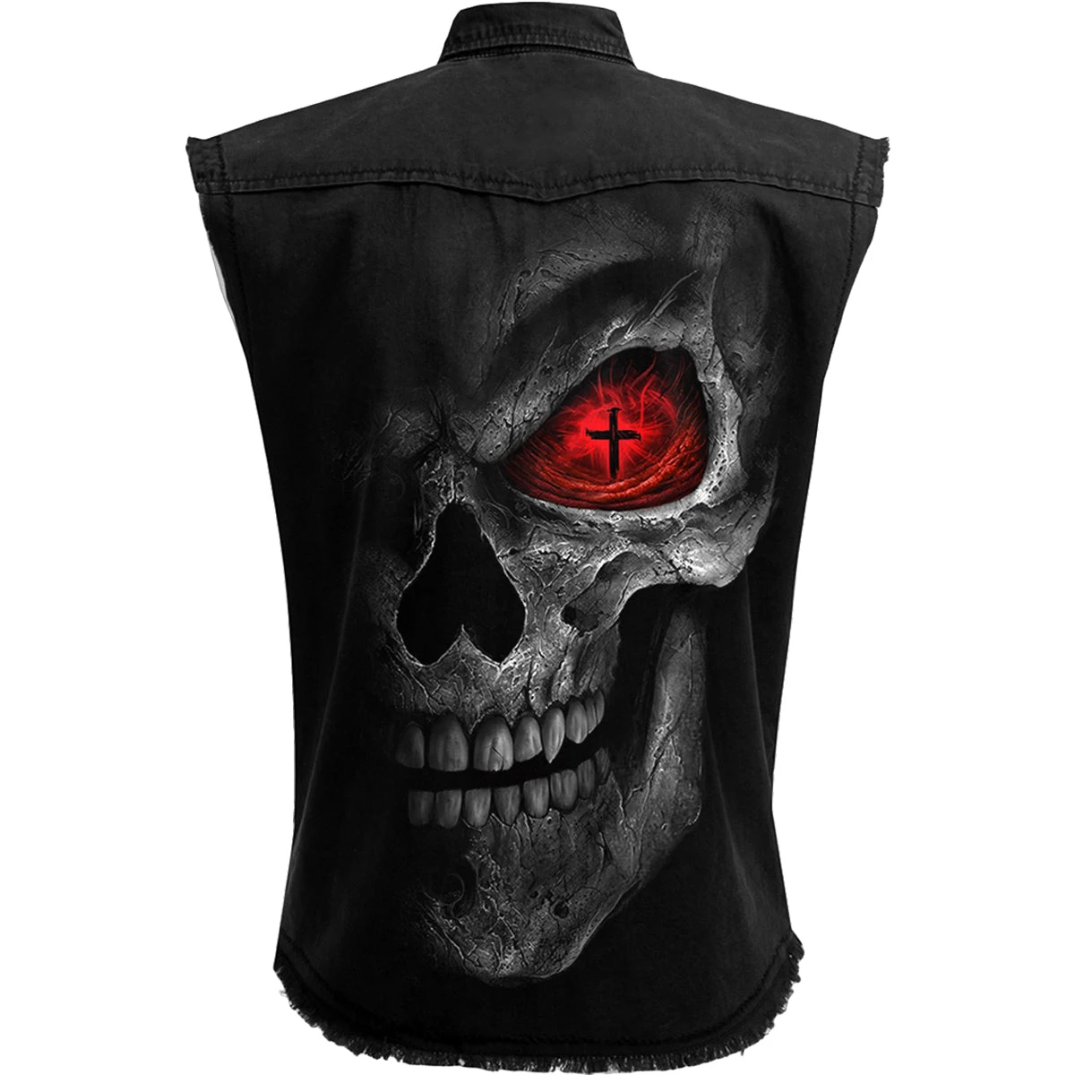 Within the hollow, all encompassing void of shadow filling this skull’s eye socket there burns a sinister, malevolent crimson light. Through this evil glow, a silhouetted apparition of a crucifix hangs suspended in the gloom. A hidden sign of hope in the darkest of times.