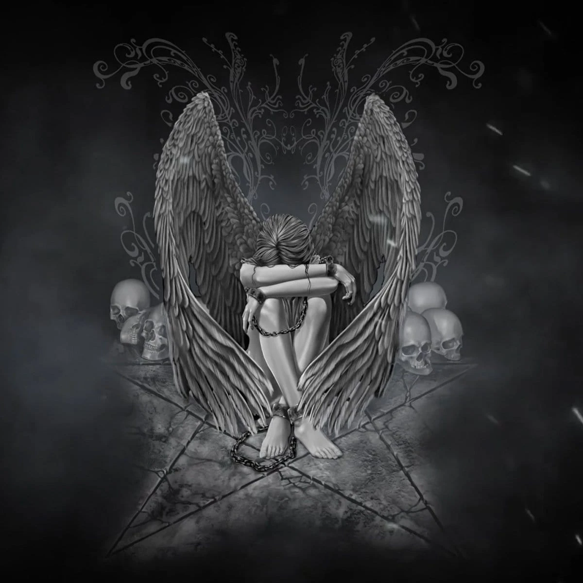 This chained, enslaved angel sits with her head hung in sorrow in the middle of a pentagram, surrounded by skulls of the dead.