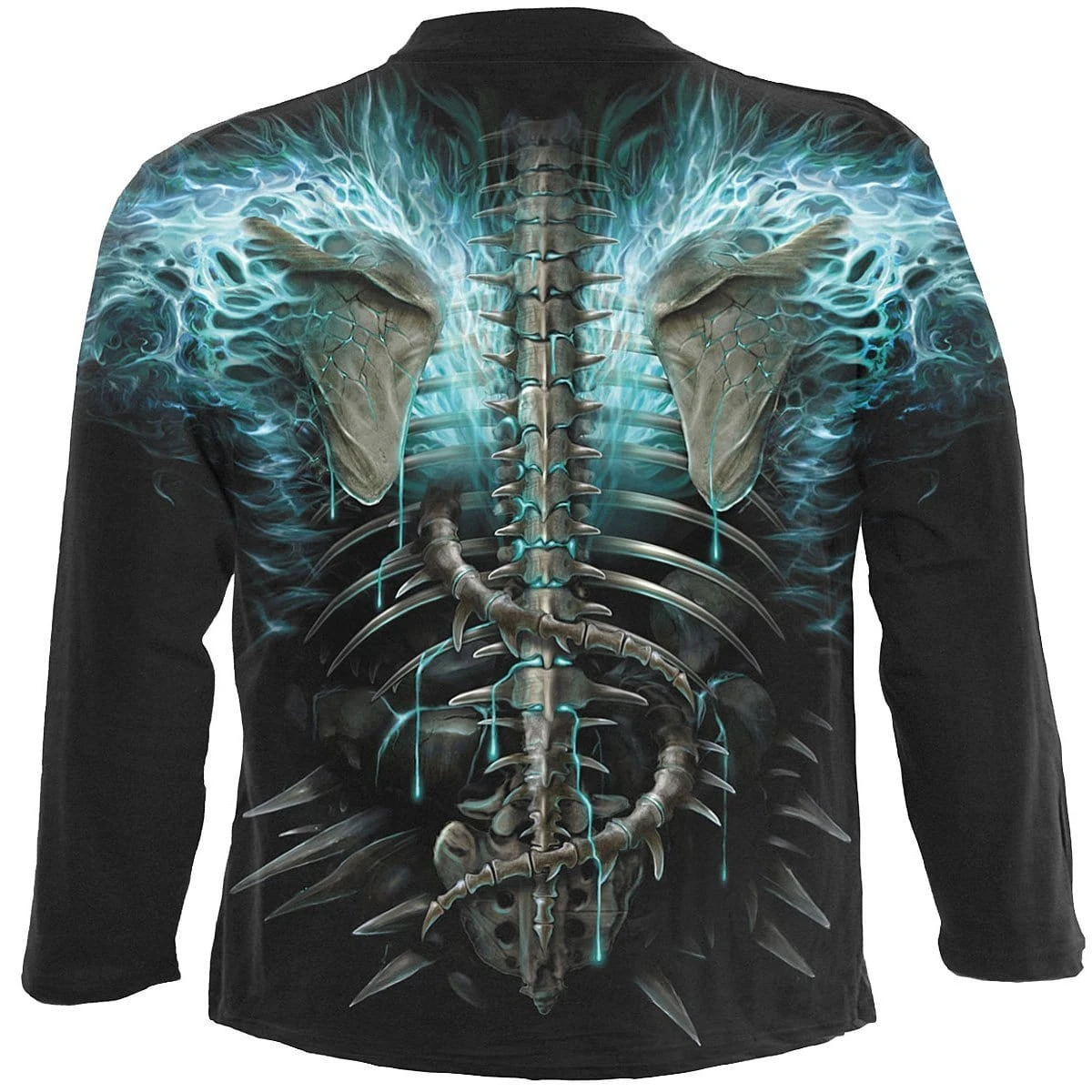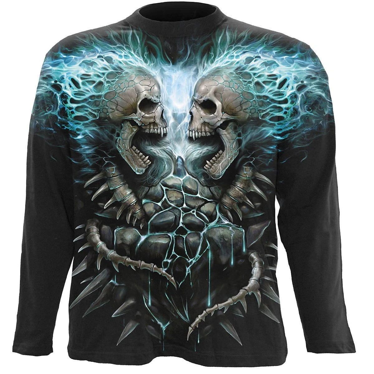 Skulls, spines & bone, dripping in melting lava & blue flames. A fiery all over print. Allover Longsleeve T-Shirt Black is made of Top Quality 100% Cotton, Interlock using skin friendly, Azo-free, Reactive dyes.