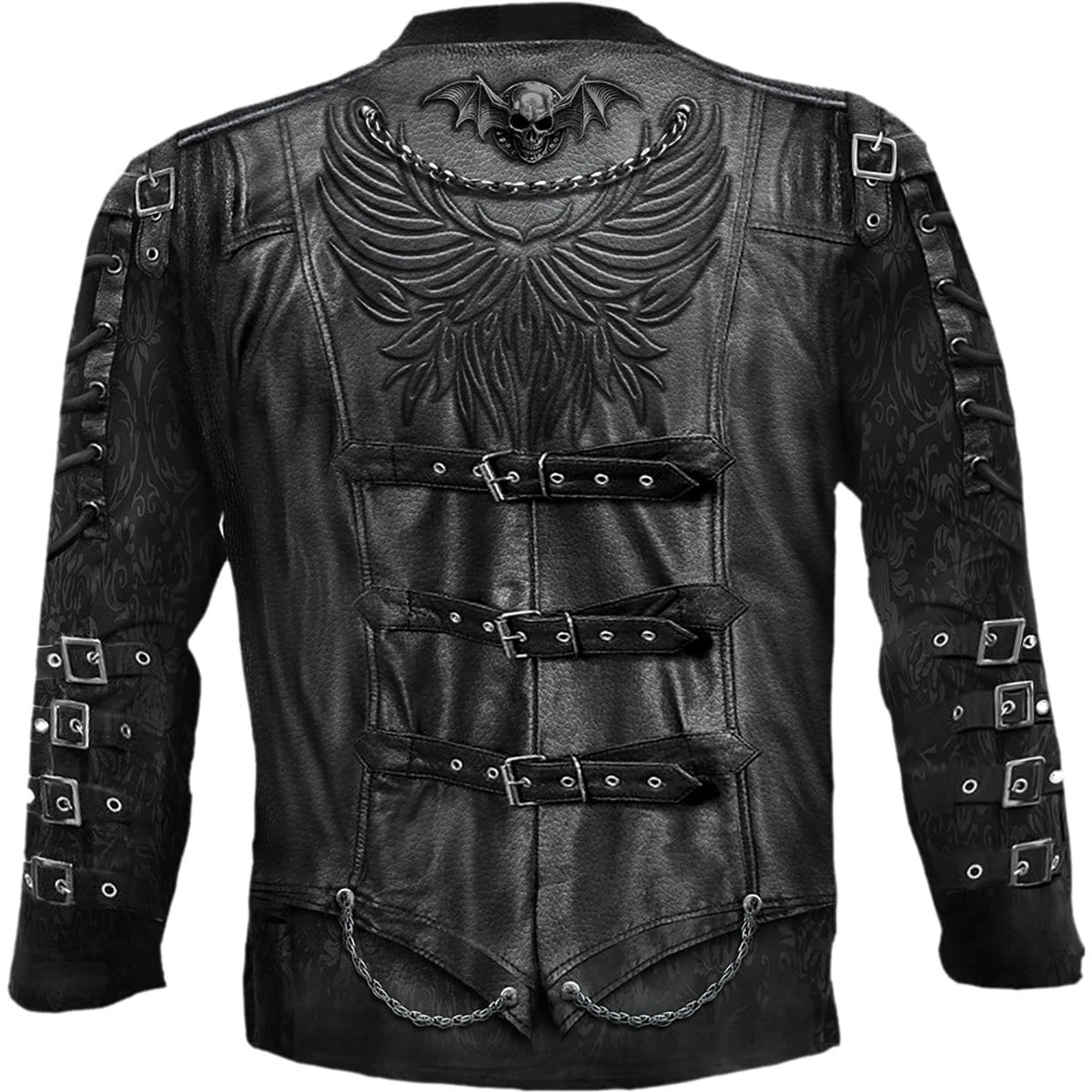 No Steam Punk biker should be without this. Realistic leather, laces & buckles with a metallic winged skull and cravat. This is Heavy Metal with a twist of Victorian elegance, and every bit the gothic Spiral masterpiece. Allover Longsleeve T-Shirt Black is made of Top Quality 100% Cotton, Interlock using skin friendly, Azo-free, Reactive dyes.