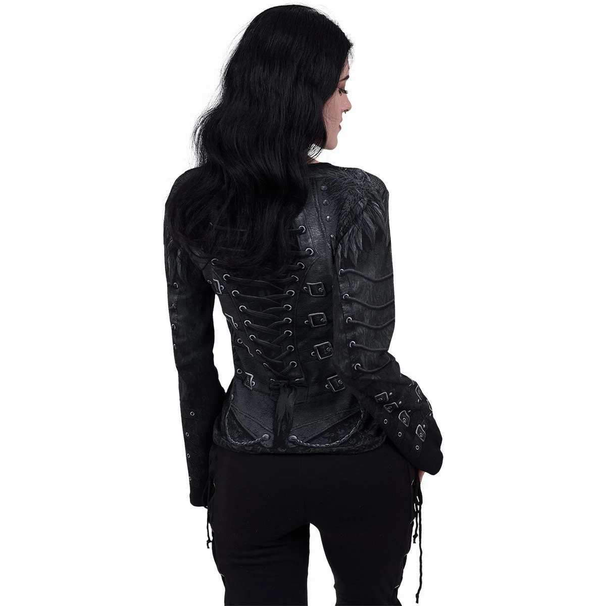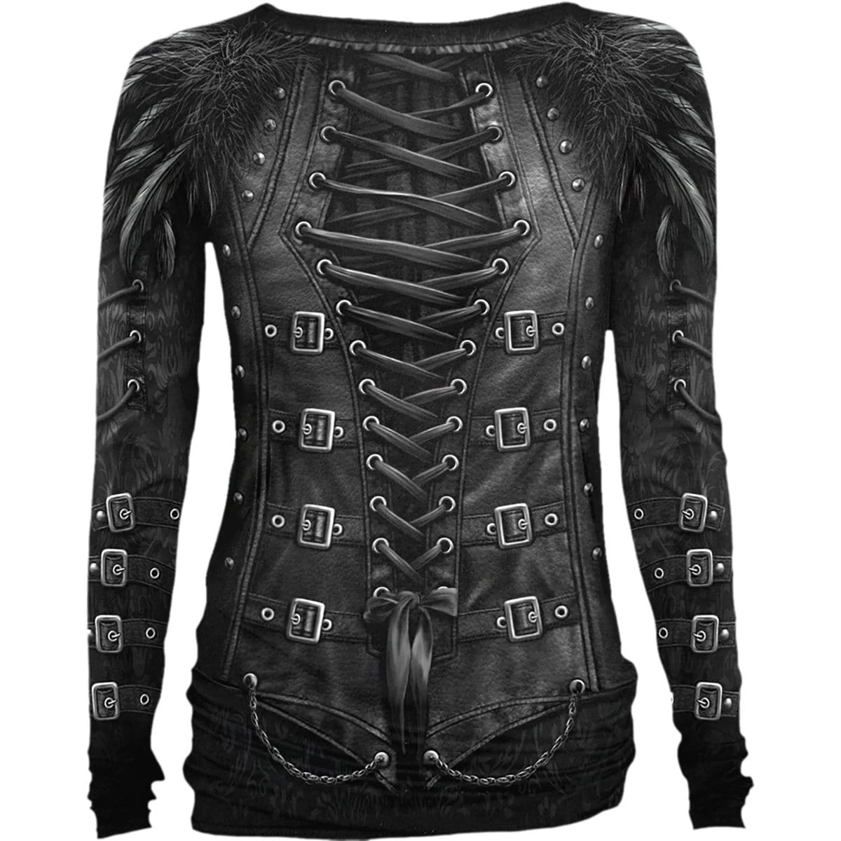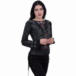 A beautifully realistic corset design with lace and buckle detailing to the sleeves. Black ribbons criss-crossing the back complete this gothic stroke of pure seductive elegance. Allover Baggy Top Black is made of Top Quality 100% Cotton, Interlock using skin friendly, Azo-free, Reactive dyes.