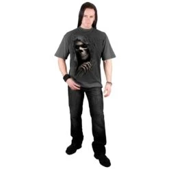 Through the tattered and torn fabric of his death robes, the Grim Reaper’s grotesque face peers out from the shadow, cold and unmoving with sunken eyes that have seen an eternity. The fabric of time wears thin. T-Shirt Charcoal is made of Top Quality 100% Cotton, Jersey using skin friendly, Azo-free, Reactive dyes.