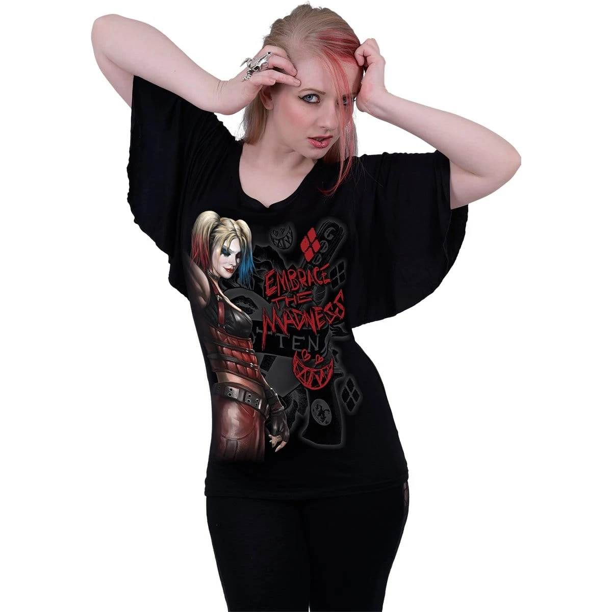 Spiral HARLEY QUINN – EMBRACE MADNESS – Boat Neck Bat Sleeve Top Black