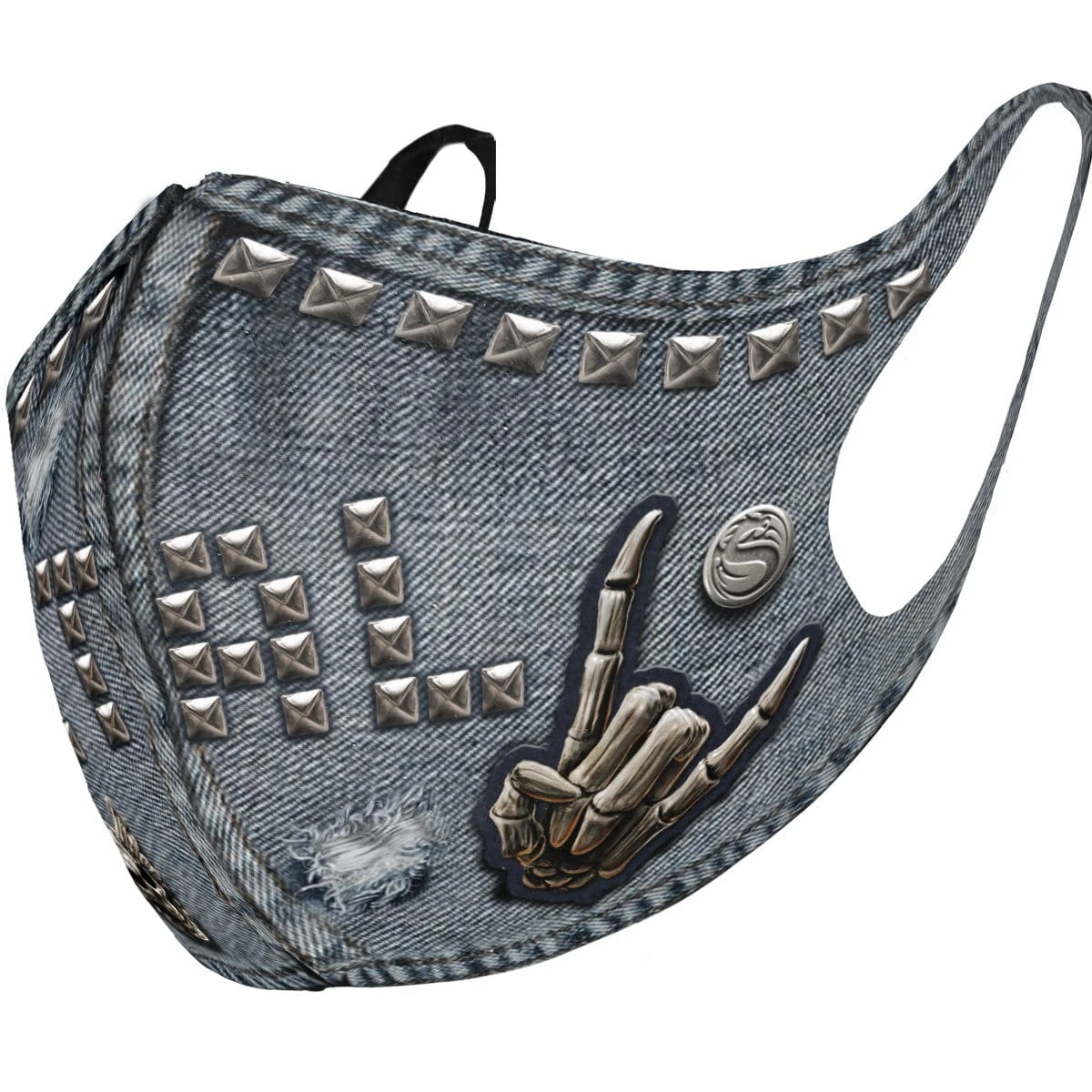 Patches and studs. Live out your rock’n’roll dreams in this realistically worn looking mock-denim jacket design. We salute you!